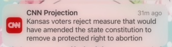 2) It’s direct: Noun-Verb-Object is the Holy Trinity of writing, whether it is the basis of a headline, the core of a lead or the guts of a tweet. In this case we know who (Kansas) did what (votes) to whom/to what or for whom/for what (to keep right to abortion). The news alert is also written in Noun-Verb-Object structure (voters reject measure) but it isn’t as direct with exactly what that measure is all about.